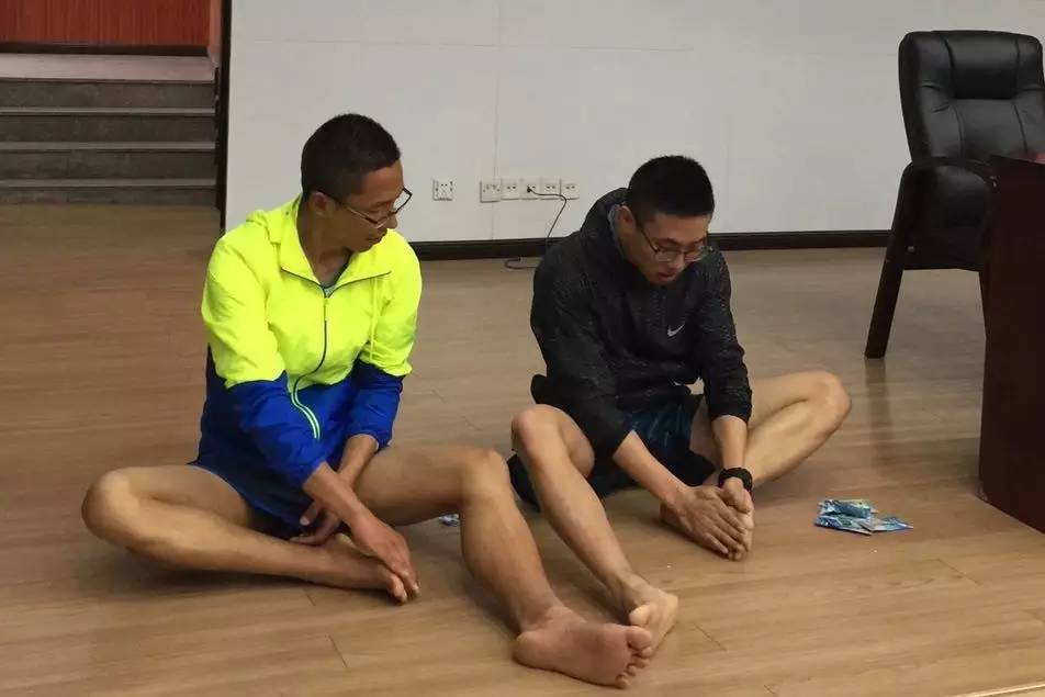 培訓師方慶(圖右)帶領(lǐng)跑友現(xiàn)場演示賽前按摩